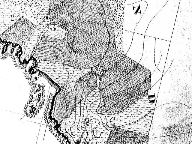 The form of the barn is an English plan (center drive) gable-roofed hay mow with sheds on all four sides. Oriented slightly off east-west, the central space is 30′ wide by 60′ long and 26′ high. The sheds on the west and south sides are 24′ wide; the one on the east is 18′; and the one on the north 14′. Given the siting of the structure and the presence of those prevailing winds coming off the Straits, the barn was probably positioned to take advantage of funneling the breeze into the center drive to winnow grain on a threshing floor. Among the associated buildings is a granary.