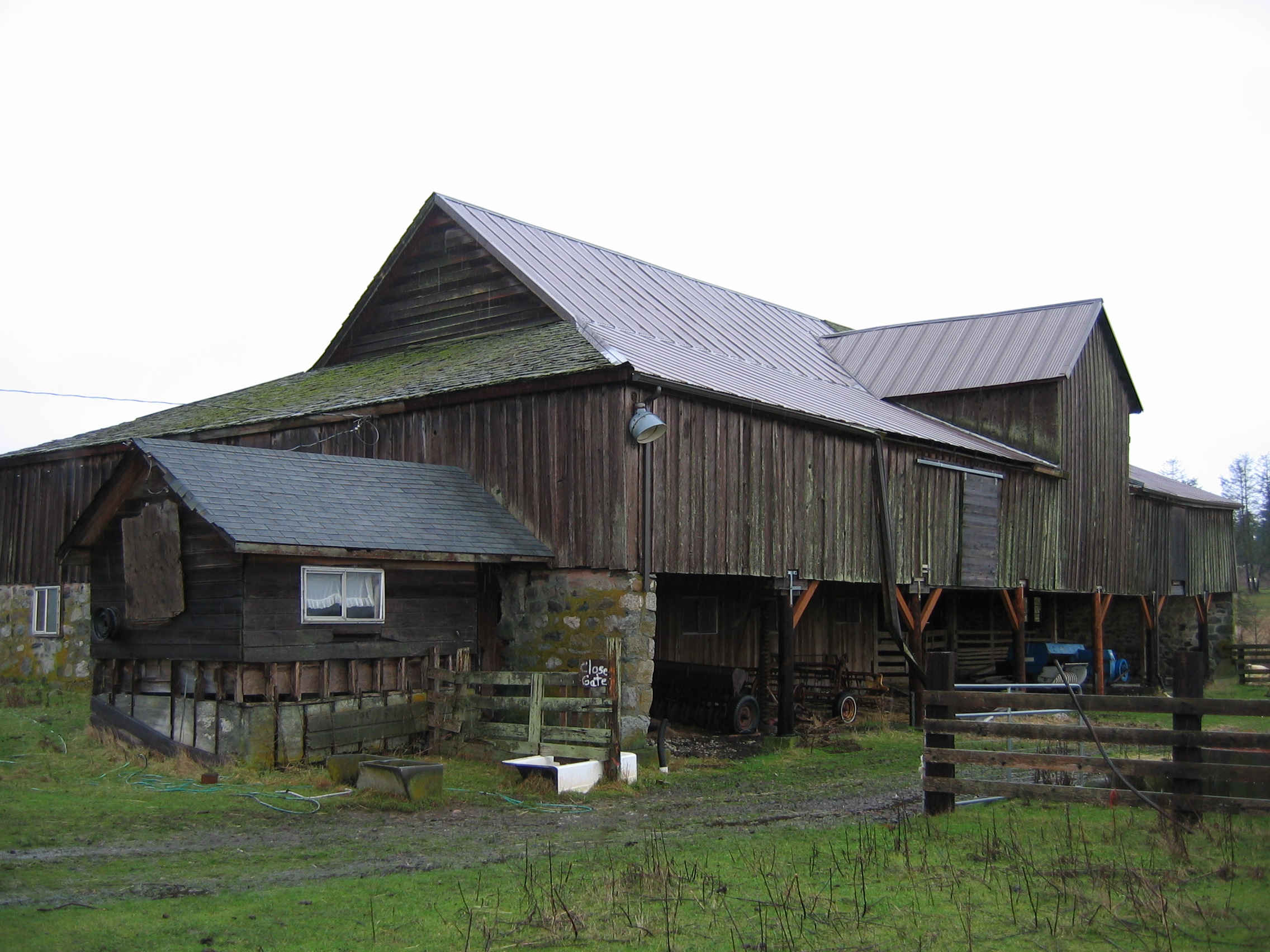 Straitsview Farm Barn, San Juan Island. Built by Peter Lawson in 1863, the barn at Straitsview Farm is a English plan (central drive) gable roofed hay mow with sheds on all four sides. Among the associated farm buildings are a granary and a machine shed. Oriented slightly off east-west, the central space is 30′ wide by 60′ long and 26′ high; the sheds on the west and south sides are 24′ wide; the one on the east is 18′ and the one on the north 14′. Given the orientation of the structure and the fact that he prevailing winds come off the Straits, the barn was probably positioned to take advantage of funneling the breeze into the center drive to winnow grain on a threshing floor.