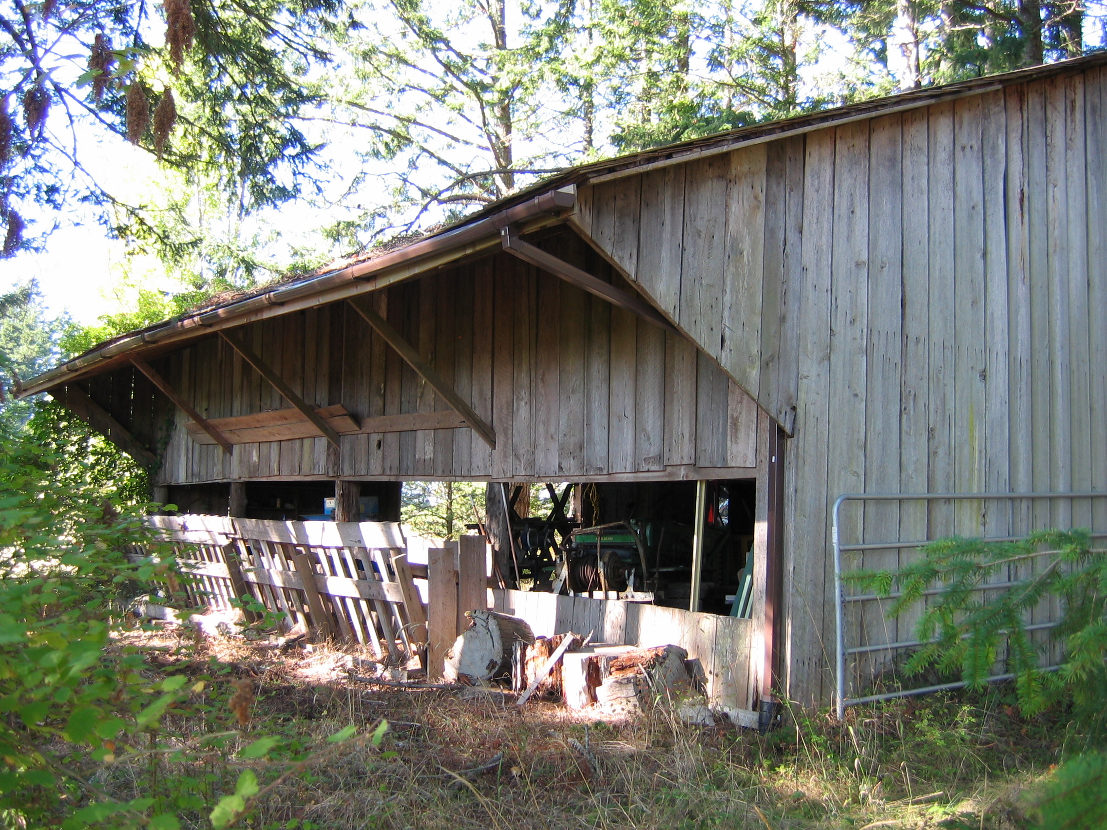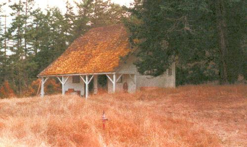 Ben Gruel Farm Barn, San Juan Island. Oriented north-south, this barn is one of several farm buildings that include a house, chicken coop, and machine shed. The main gable area, which was used as a hay mow, measures 18′ wide by 52′ long and is 26′ high; a full length, 14′-wide shed lies along the west side and a partial, 18′-wide shed along the north part of the east side. The structure, which has log posts and beams but milled lumber rafters, is in poor shape, with much of the walls gone. There are remains of the old hay door and rail and trolley system.