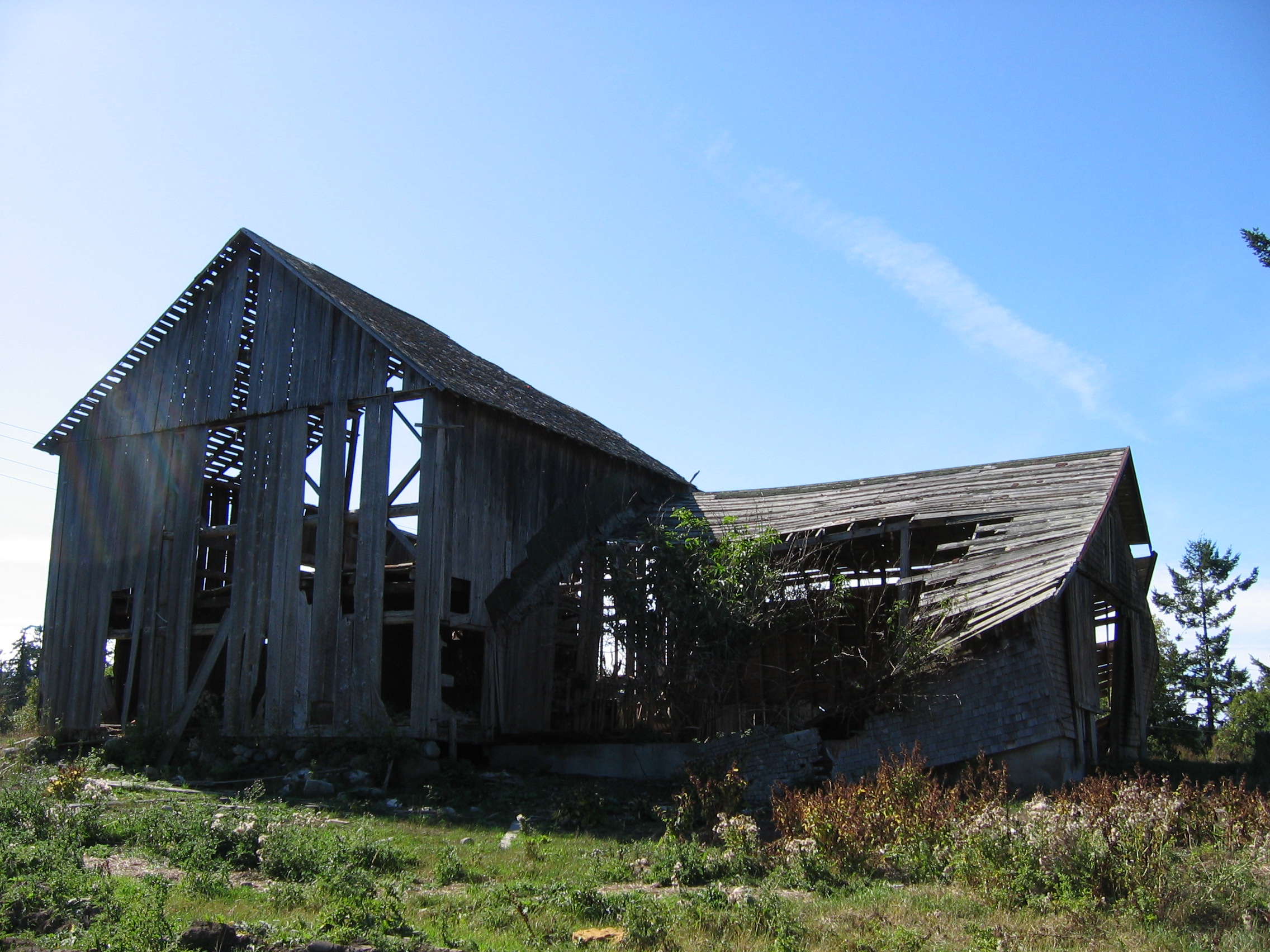 Wilson Farm Barn, Lopez Island. Originally farmed by the Wilson family, and later the McCauleys, this farm was eventually owned by Roy Berg. The barn, which is largely deteriorated, consists of two gable-roofed sections: a main 30′-wide by 54′-long, 30′-high hay mow oriented east-west, and a 36′ by 30′ addition to the north. Built of milled lumber in a post and beam system, the main portion appears to have had a center-access door to the hay mow as well as stanchions on the east side. It is not clear what the north addition was used for. The farm also has a milk house, granary, and remains of a silo. The Wilsons probably built the main barn around 1905-1912, and Sam McCauley added the wing to the north in the 1940s.