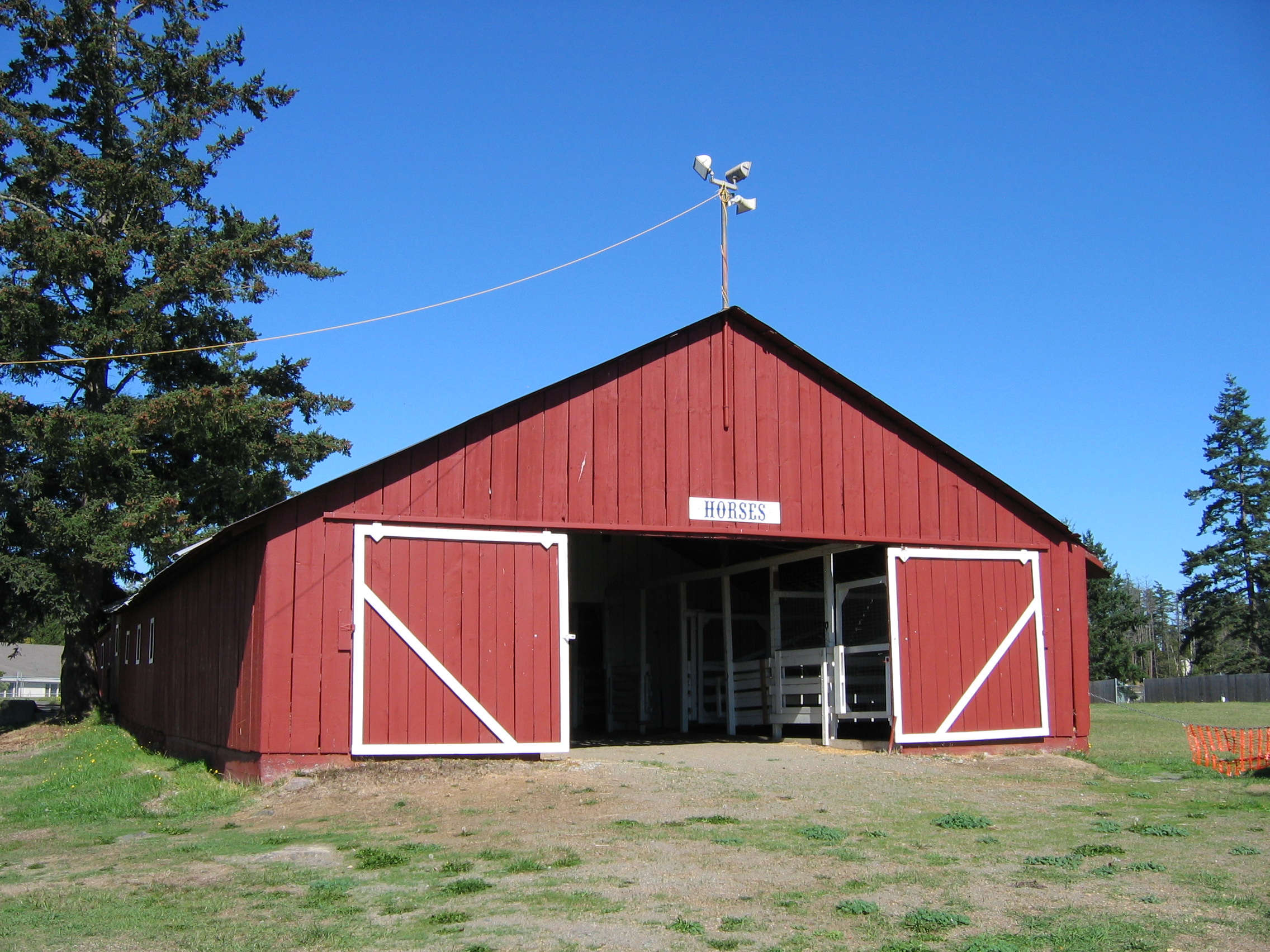 San Juan County Fair Horse Barn, San Juan Island. This horse barn was constructed in 1924 as part of the San Juan County Fairgrounds just south of the Friday Harbor town limits. It consists of two sections: an older, 30′-wide, 110′-long, 17’8″-high section to the north and a newer, 36′-wide by 82′-long, 18′-high section to the south. Both sections are wood frame on top of concrete stem walls with wood truss roof systems. Stalls line both side of a central aisle on the inside, and there are additional stalls in sheds added to the east side of the building. The building is located in the northeast corner of the fairgrounds, where there is a practice arena and other, separate horse stalls.