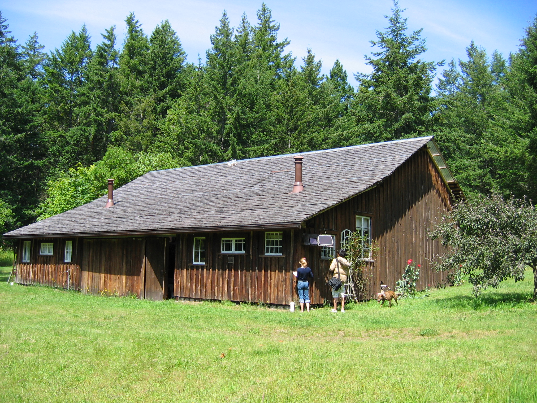 Ericksen Barn, Prevost. The Ericksen barn was built in 1908 by Erick Tobias Ericksen (1869-1934), who was born, raised, and married Kristine Marie Christiansen (1871-1949) in Norway. The Ericksens and their growing family of three children (with seven more to come) arrived on Stuart Island in 1902, through Marie’s brother, P.N. Christiansen, who was the Keeper at Turn Point Light Station. In addition to farming–eggs, dairy products, geese, and turkeys, among many crops–Erick cut cordwood for the mail boat and the kilns at Roche Harbor and Marie was postmistress at Prevost from 1910-1940. The barn, which is oriented north-south, is 40′ by 50′ and includes a 15-foot shed for milking dairy cows. It has a broken gable roof, and is constructed with log posts and beams and dimensional lumber rafters. According to the August 29, 1908 San Juan Islander, it was constructed with the help of neighbor Willis Maxfield, and, according to Jim Bergquist’s The History of Stuart Island, Erick and Marie’s oldest daughter Martha.