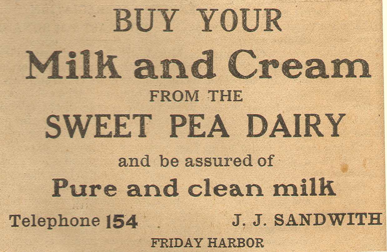 Although practically every homestead had a milch cow or two early on, dairying soon became a significant element in the agricultural economy of San Juan County. The number of dairy cattle county-wide gradually rose from 247 in 1880 to 443 in 1890, 774 in 1900, 1,916 in 1910, and 3,175 in 1920. Increased dairy production in turn led to the establishment of a creamery in Friday Harbor in 1901. Three years later, the local newspaper reported that 3,000 pounds of cream had been converted to 1,000 pounds of butter in one day, and that the creamery was so busy it had to introduce a night shift to run 24 hours a day. By 1907, the creamery produced 120 tons of butter annually. With the introduction of the first county agent in 1921, there was a big push to improve stock through selective breeding, animal health through tuberculosis testing, and production through cream content testing. The formation of the San Juan County Dairyman’s Association in 1924 helped this movement by providing a forum for farmers to discuss improvements.